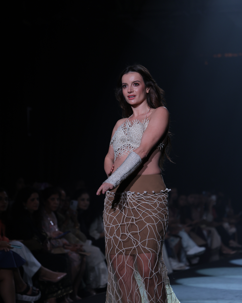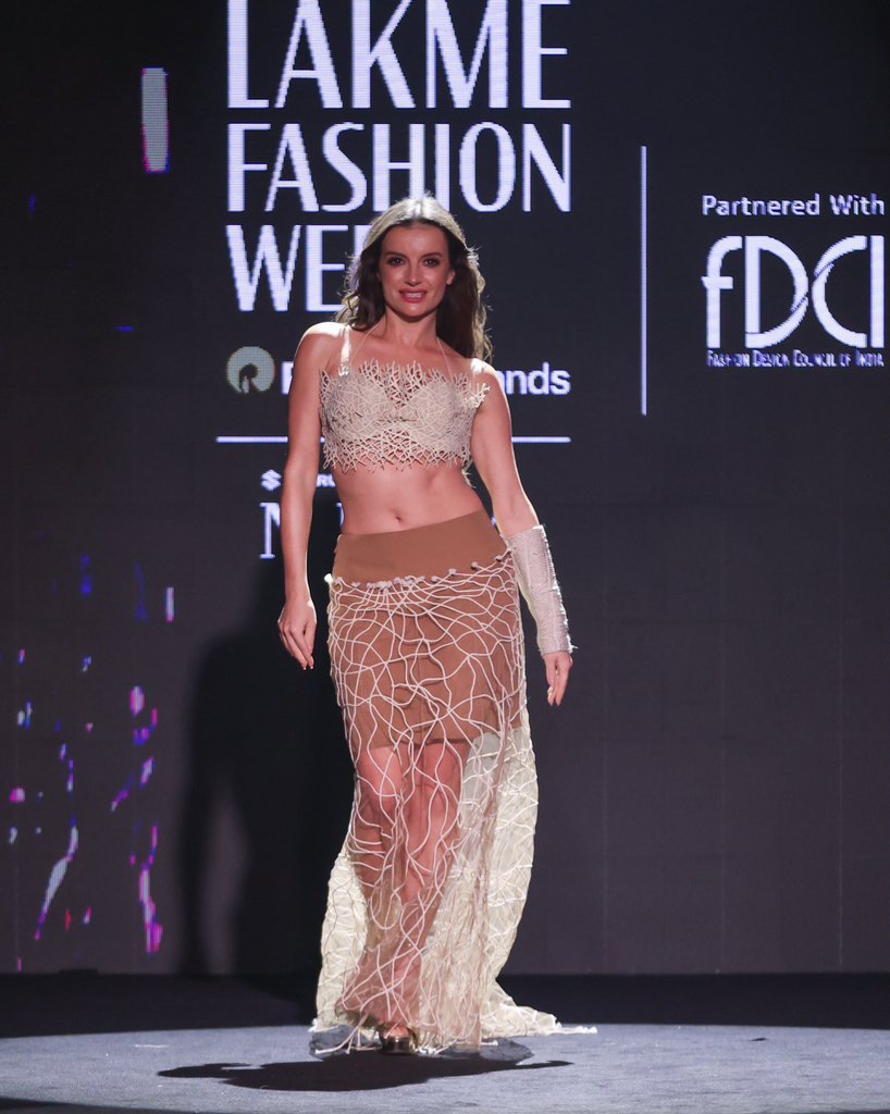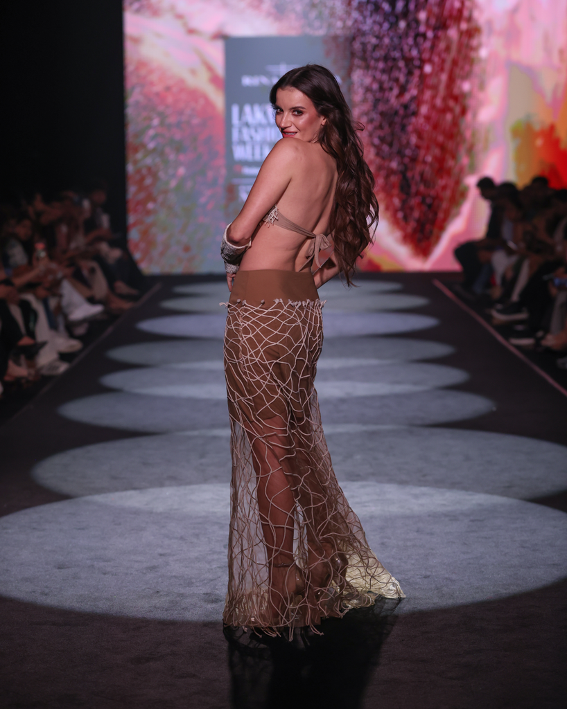 Lattice Cotton Jaali Bra Top (Price: ): The top is a sculptural bra top featuring lattice cotton jaali all over. This intricate net structure creates a bold, textural bodice and a daring silhouette.
