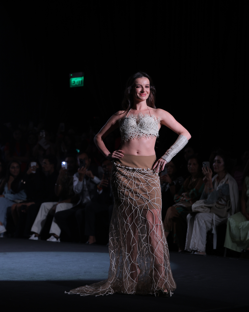 An intricate and high-fashion two-piece set that showcases extraordinary artisanal craftsmanship. This outfit is a breathtaking study in texture and transparency, perfect for exclusive events, red carpet appearances, or editorial styling.