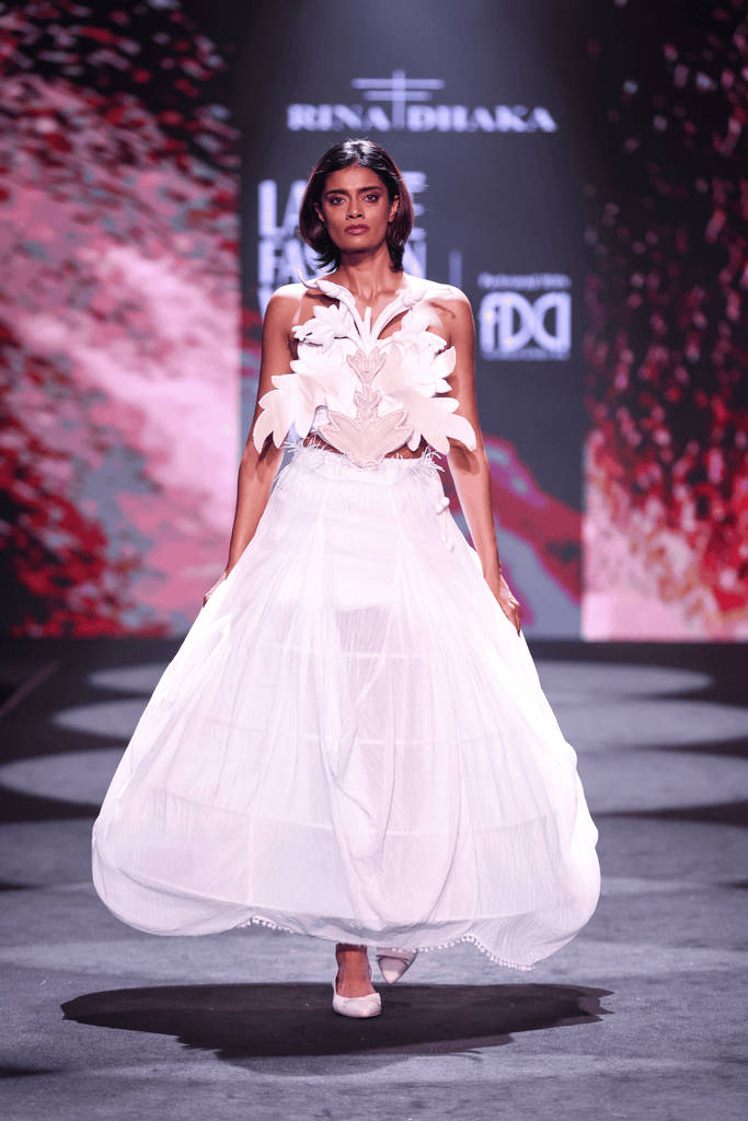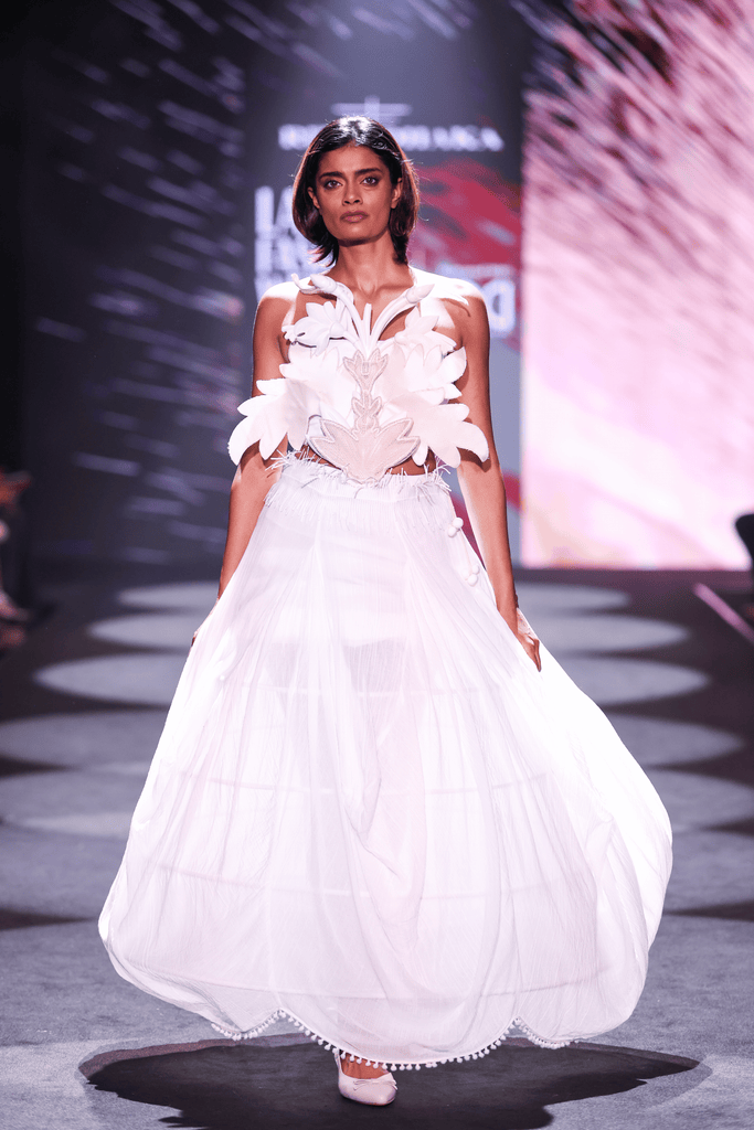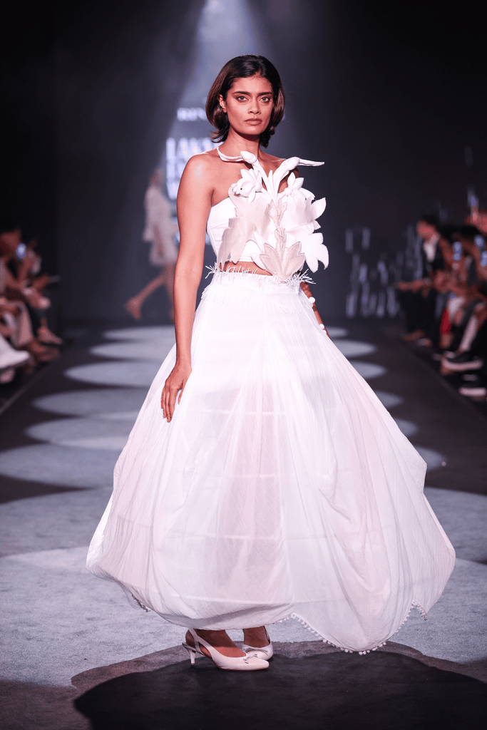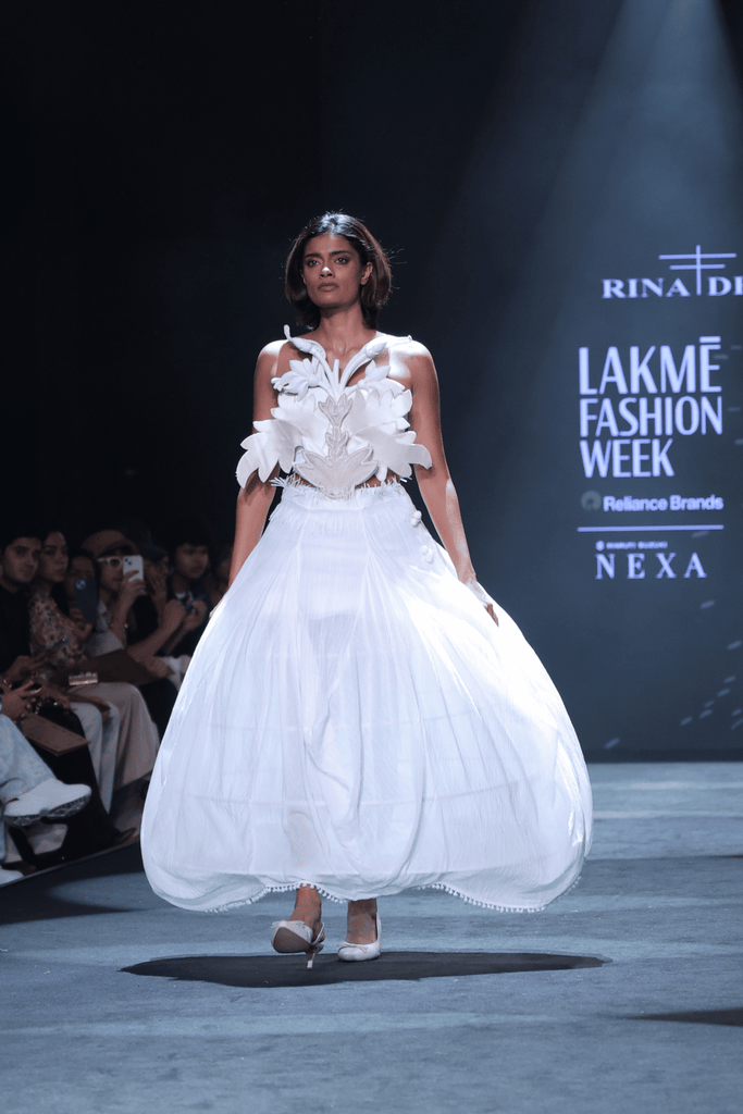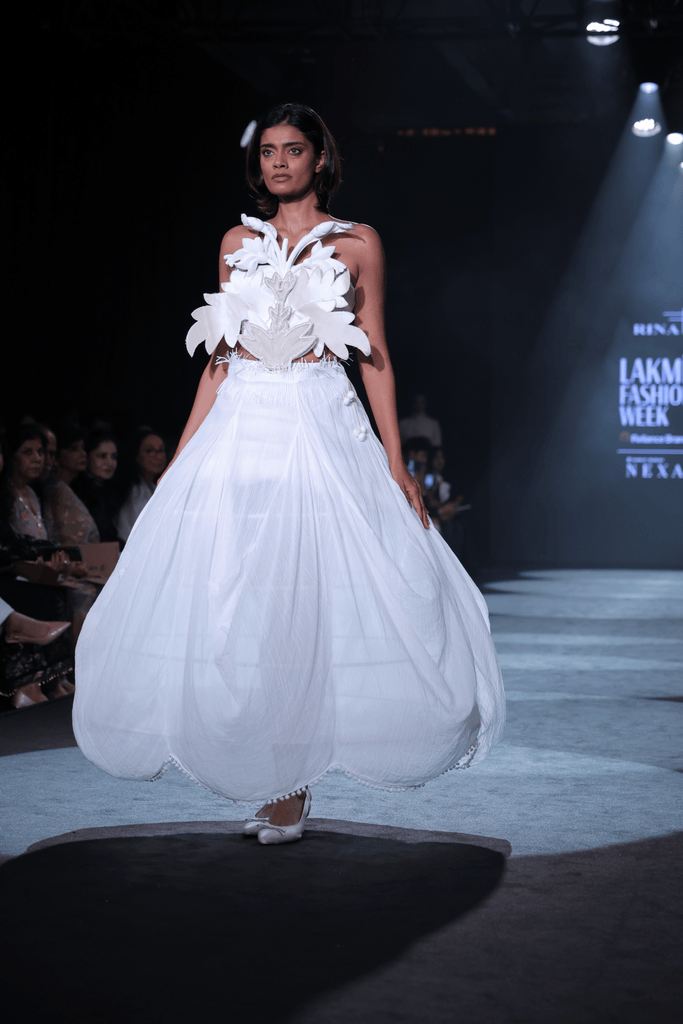 The bottom is a flowing Dhoti Cowl Long Skirt crafted from soft cotton crepe woven fabric. The design includes a lining but no can-can, ensuring a natural, fluid drape and exceptional volume that moves gracefully.