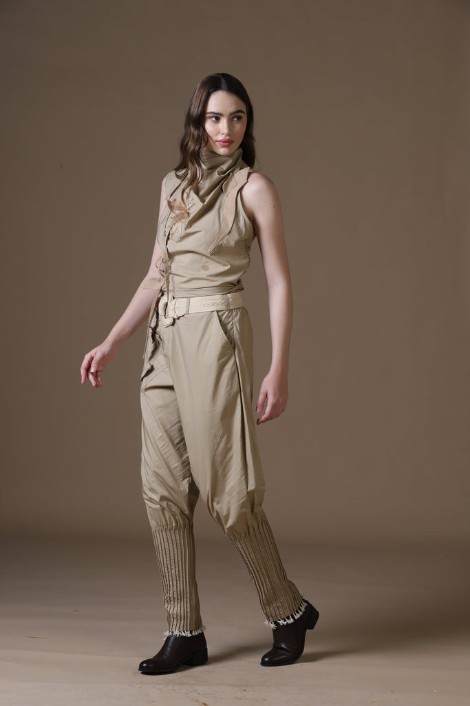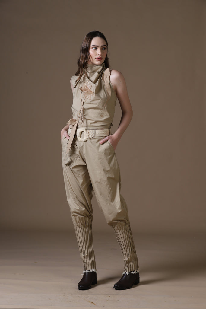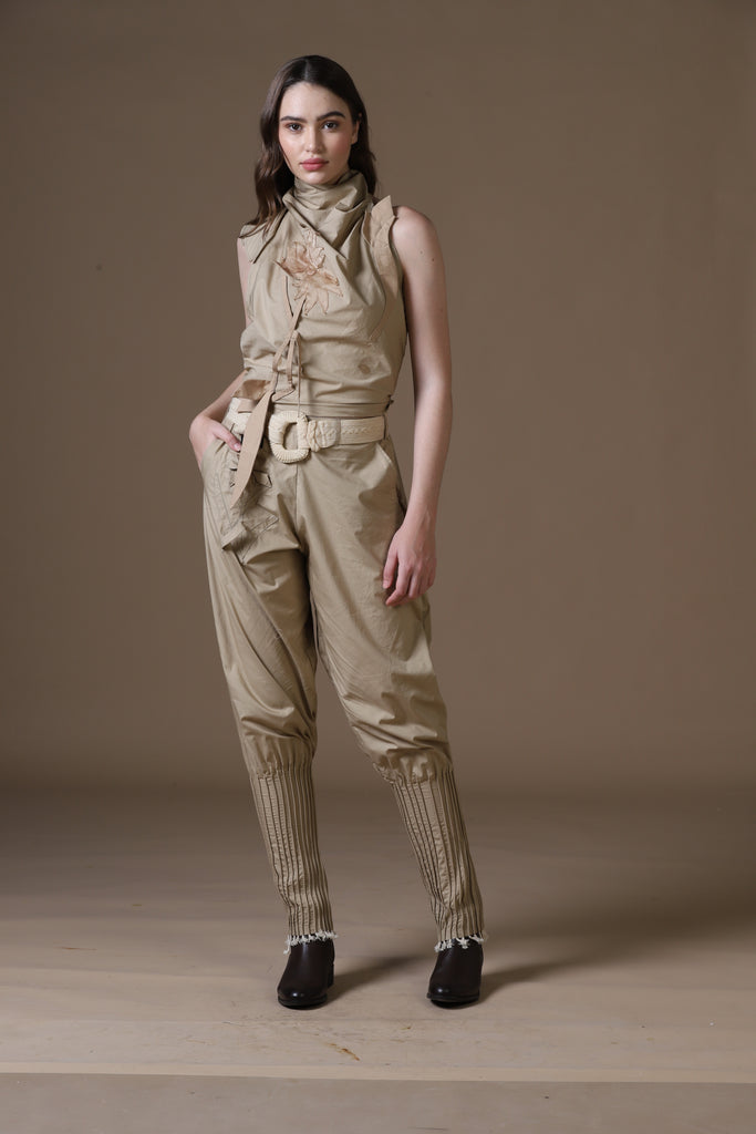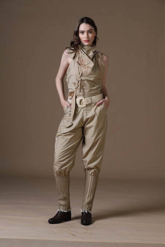 These contemporary Khaki Poplin Jodhpur Style Pants redefine utility wear. They feature sculptural detailing including dori insert pintucks and delicate little floral 3D floral patchwork, adding unique texture and craftsmanship to the lower leg.