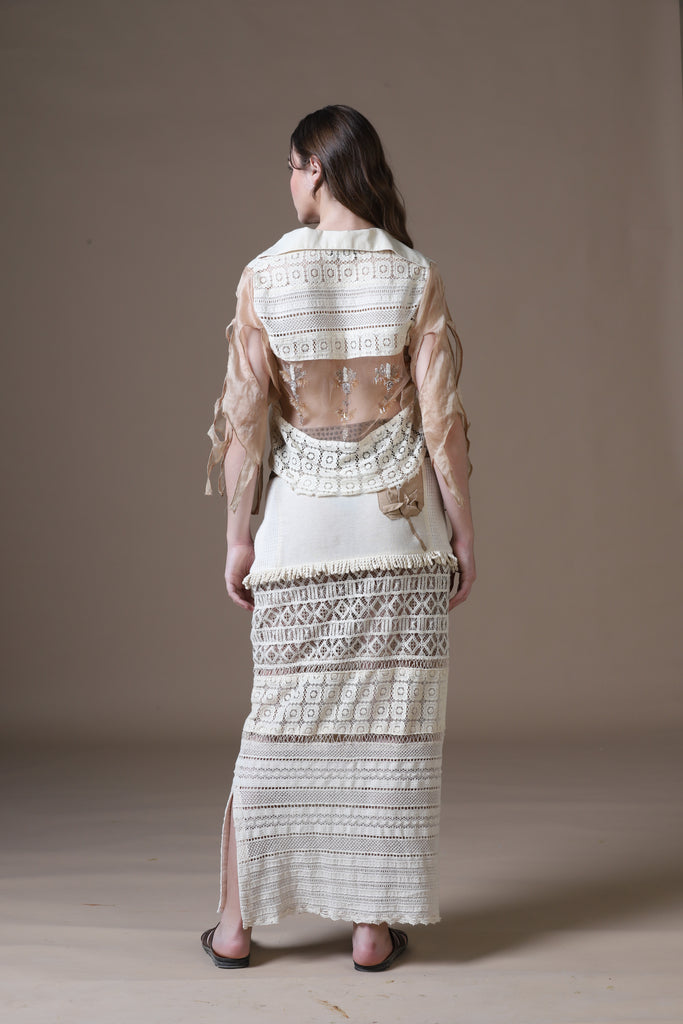 Lace Net Construction: The dress is made from lace net, creating a continuous, intricate pattern throughout the entire garment.