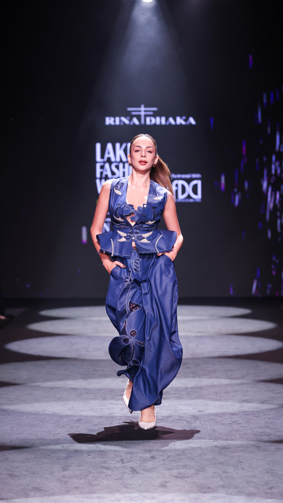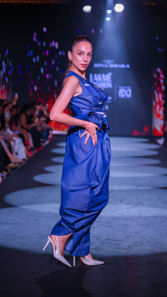 Denim Waistcoat The centerpiece is a structured Denim Waistcoat featuring an elegant peplum silhouette and distinctive side wings. It is richly detailed with hand embroidery and cutwork, making it a refined piece of outerwear.
