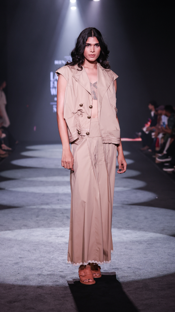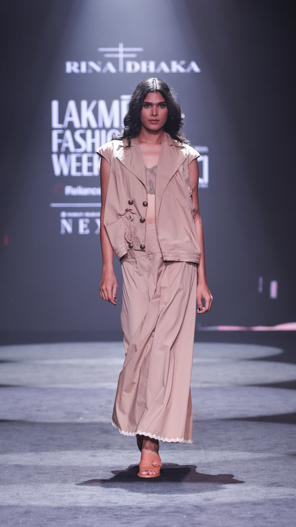 Silhouette: A contemporary blend of anti-fit outerwear and a tailored maxi skirt.