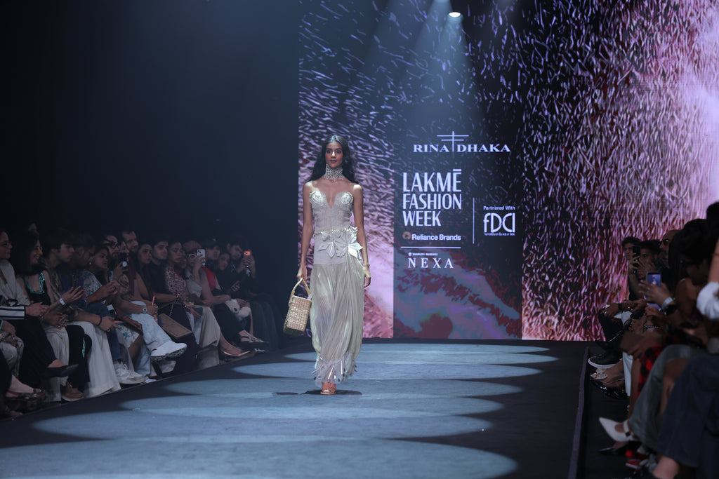 Plissé Maxi Skirt Price: 24,000 The skirt provides a dramatic contrast with its fluid movement. Crafted from soft, textured plissé fabric, it drapes elegantly to the floor. The hem is the focal point, featuring a wide border of hand-embroidered sequins and sheer strip detailing that catches the light and adds a final touch of artisanal glamour. The overall look is dynamic and luxurious.