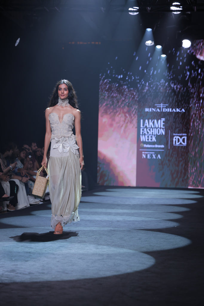 Corded Pintuck Bustier Price:15,000 The strapless top features a structured bodice defined by dense corded pintucks, which creates a beautiful, horizontal texture. The neckline is adorned with cutwork hand embroidery application, adding intricate, three-dimensional elements that frame the décolletage. The bustier design ensures a flattering, supportive fit.