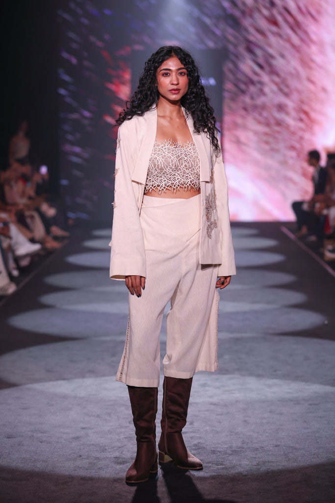 A luxurious and conscious three-piece set crafted entirely from 100% handloom organic cotton. This outfit is a celebration of artisanal technique and natural texture, offering a versatile and sophisticated look that is perfect for resort wear or high-fashion daytime events.