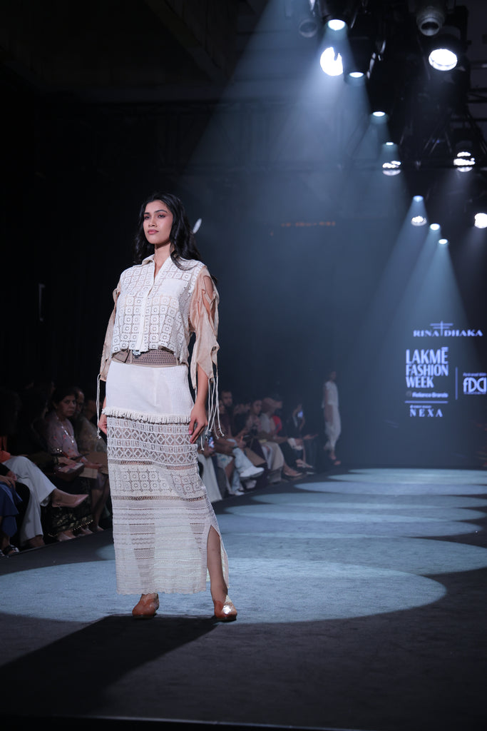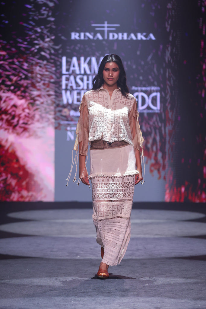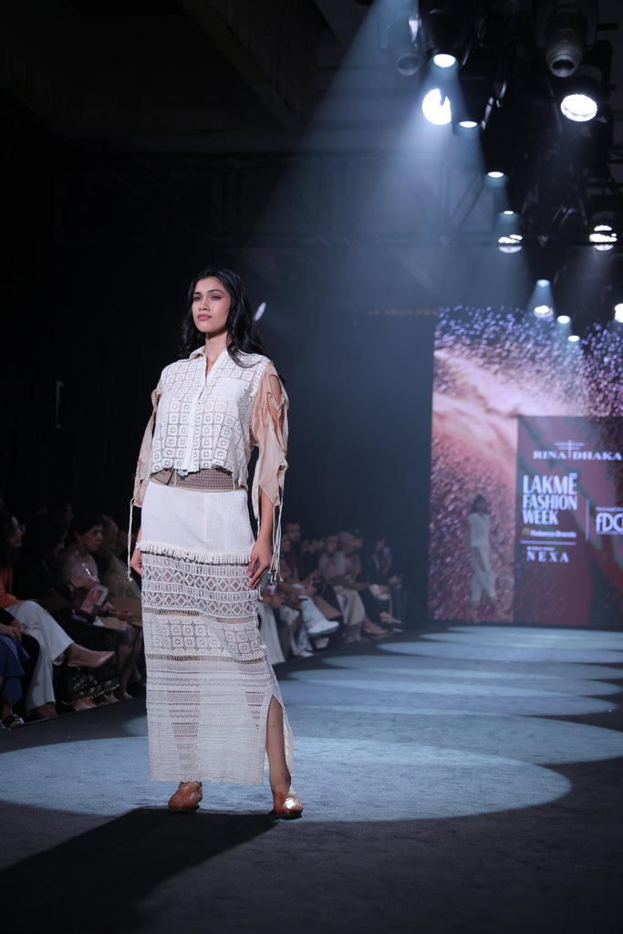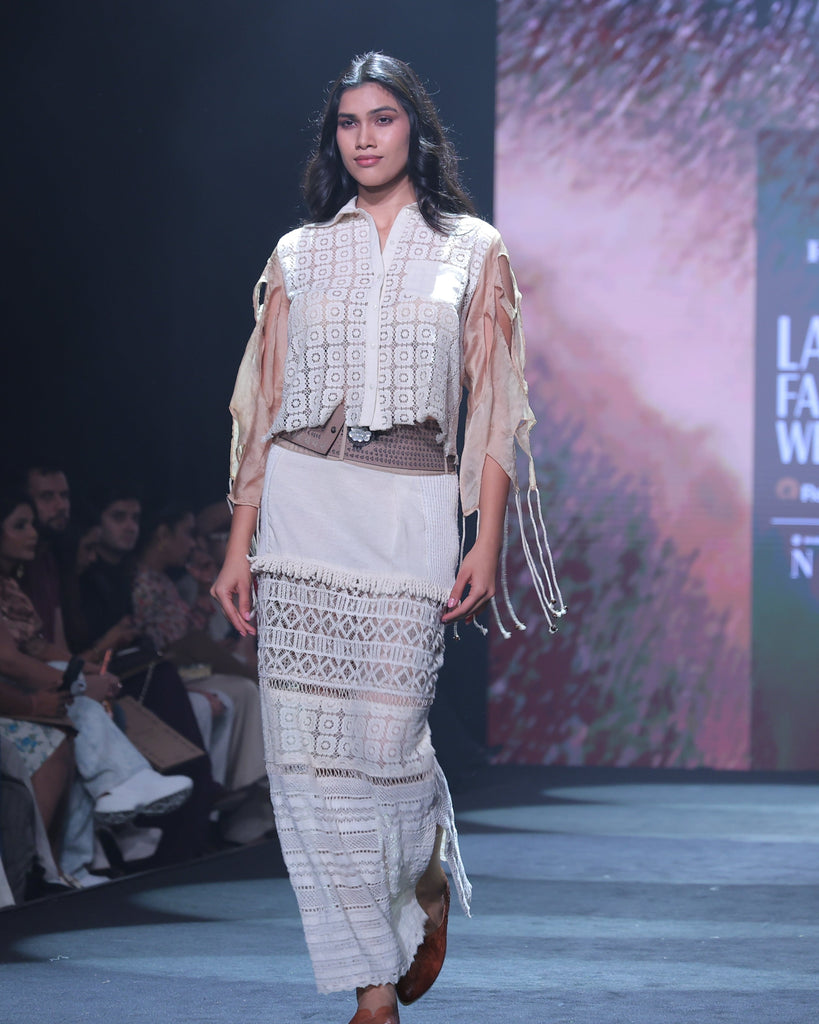 Front Open Lace Blouse (Price: 15,000) The blouse is a lightweight, cropped layer designed with a front open closure. It is beautifully enhanced with handwork across the bodice and refined sleeve cutwork details, allowing a glimpse of the skin and adding a sheer, airy quality to the shoulders.