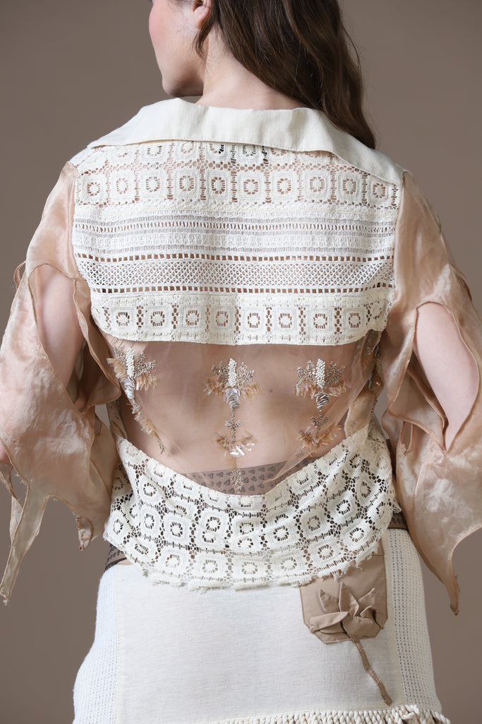 Silhouette: A harmonious blend of structured layering and fluid lace textures.
